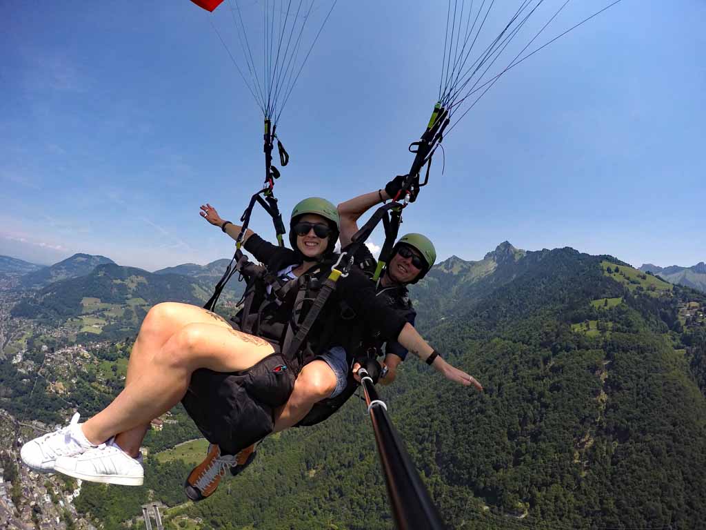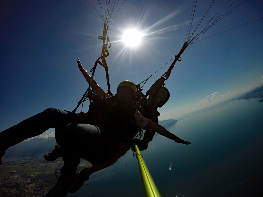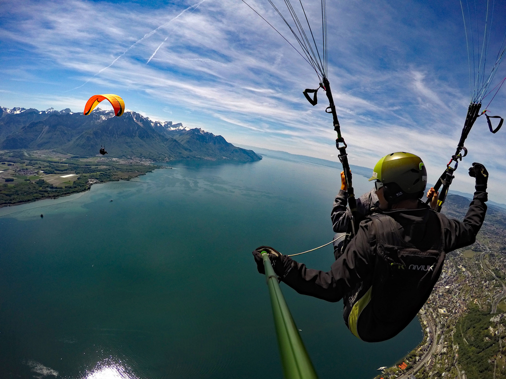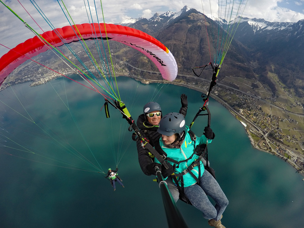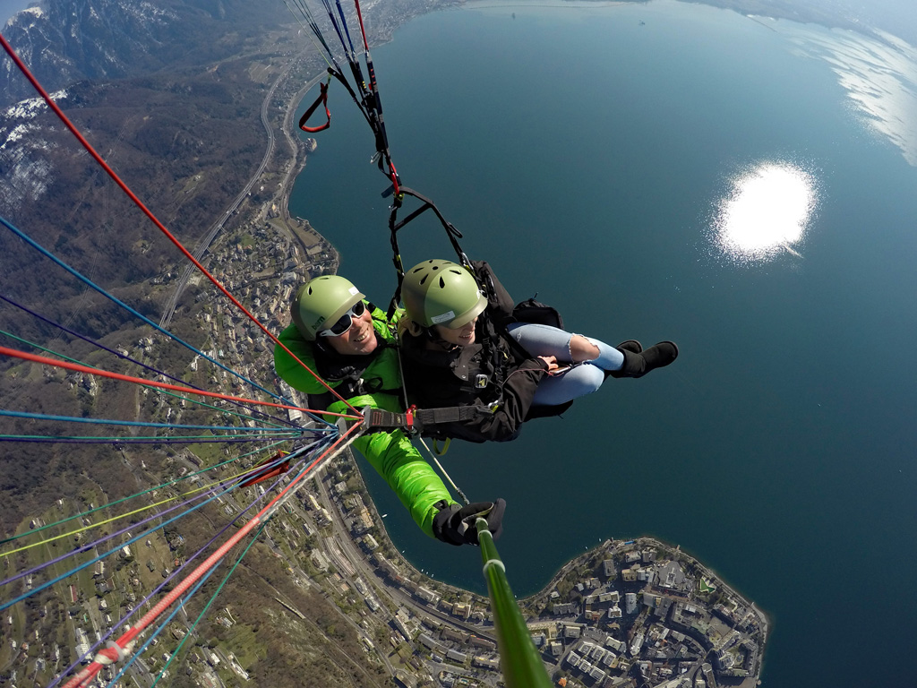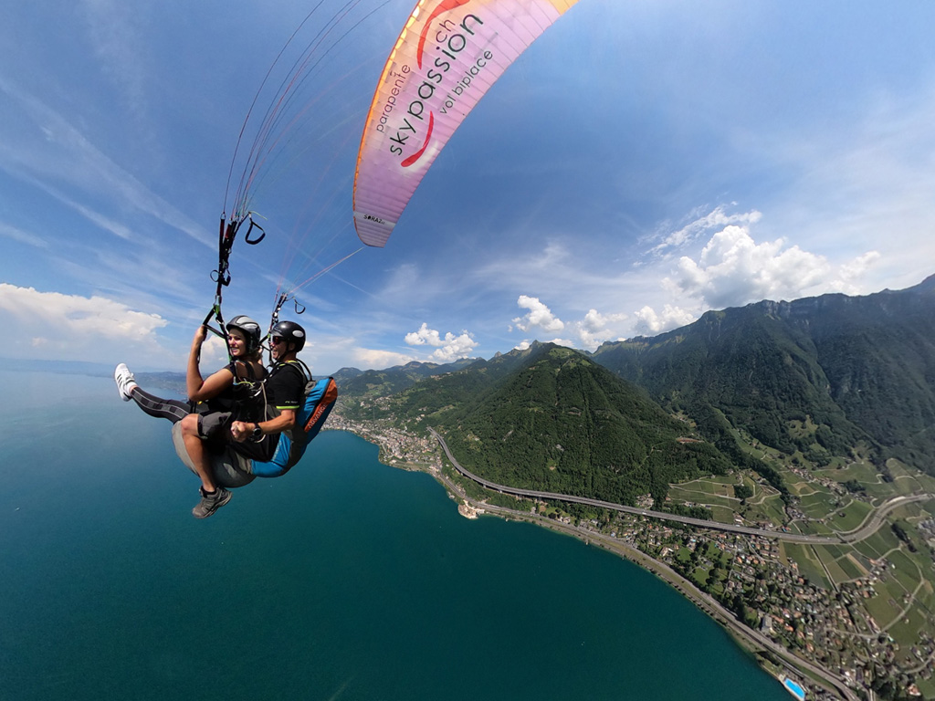 Décollage aisé et vue imprenable sur le lac Léman, le Château de Chillon sous vos pieds avec Montreux et la Riviera en toile de fond.